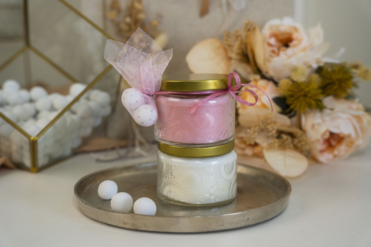 Πρωτότυπη μπομπονιέρα βαζάκι με αρωματικό κερί . Μπορείτε να επιλέξετε μόνο το βαζάκι με το αρωματικό κερί ή να επιλέξετε την ολοκληρωμένη μπομπονιέρα. Η ολοκληρωμένη μπομπονιέρα περιλαμβάνει 5 κουφέτα κλασικά Χατζηγιαννάκη δεμένα στο βαζάκι. Αν επιθυμείτε κάποιο διαφορετικό χρώμα μπορείτε να το αναγράψετε στα σχόλια.