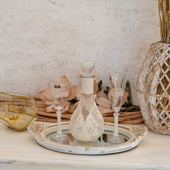 Σετ γάμου καράφα ποτήρι με φιόγκο από μόκα δαντέλα και strass.. Η καράφα είναι στολισμένη από ιβουάρ δαντέλα στη βάση με σχοινί ναυτικό σε ιβουάρ απόχρωση. Επιλέξτε το αντίστοιχο ποτήρι σαμπάνιας για την δεξίωση.