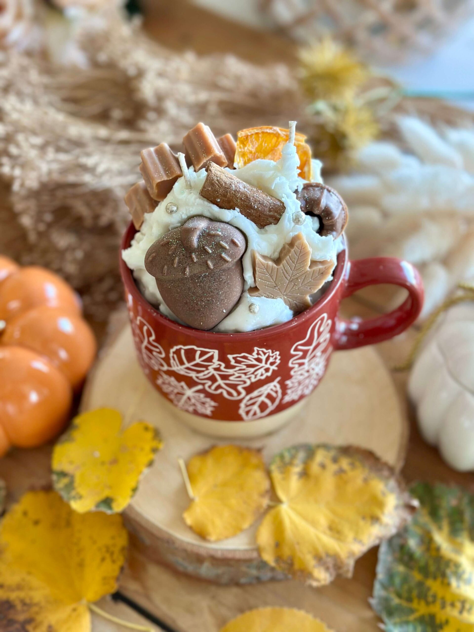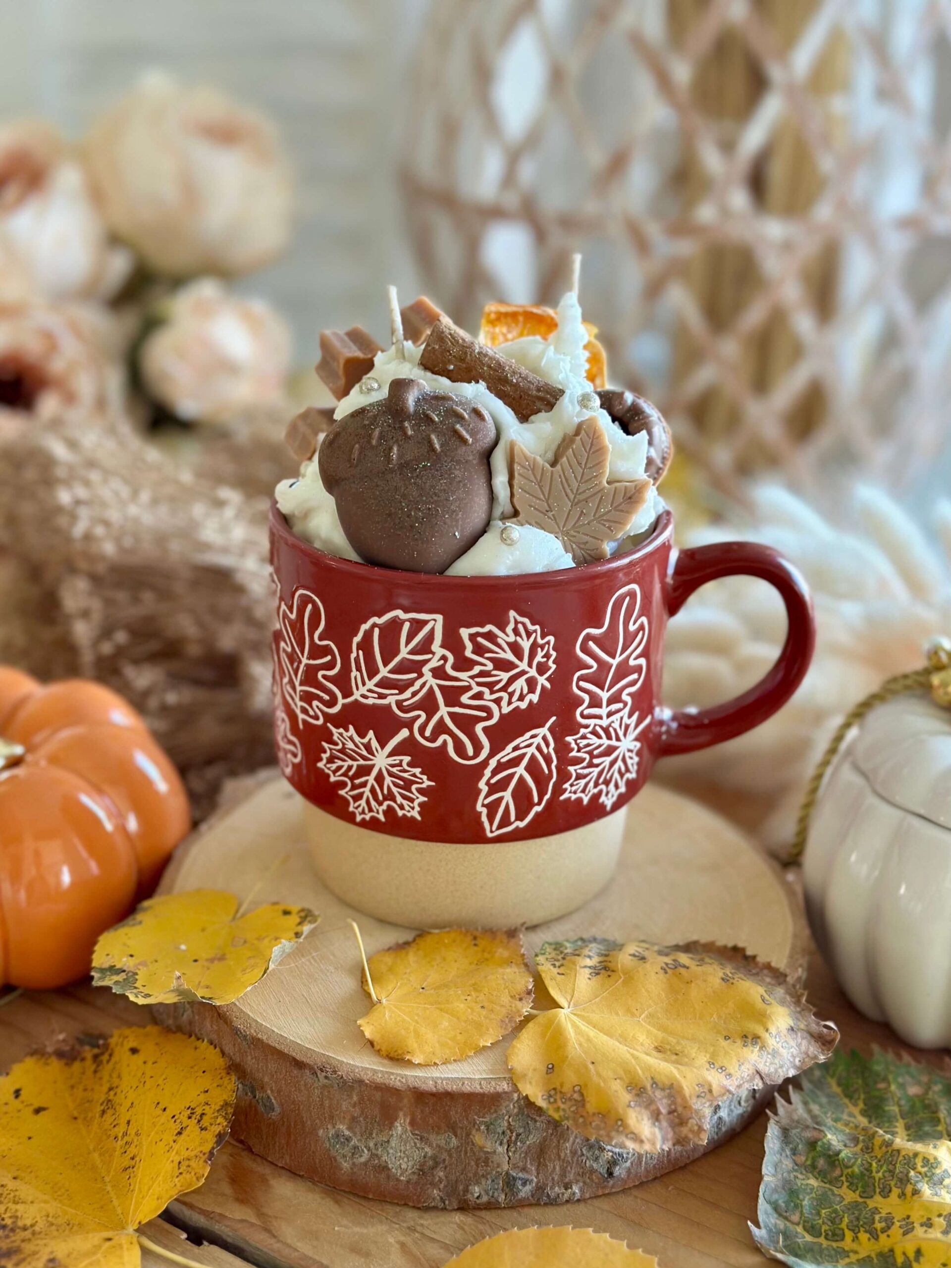 Μια φθινοπωρινή δημιουργία γεμάτη γοητεία! Στολισμένη με βελανίδια, φύλλα και αρώματα δάσους, αυτή η κούπα ξυπνά τη μαγεία της συγκομιδής. Το άρωμα φουντουκιού και καραμέλας χαρίζει γλυκιά θαλπωρή και αναμνήσεις από πρωινά με ζεστό ρόφημα και φρεσκοψημένα γλυκά. Ιδανική για να στολίσεις το σπίτι σου ή να τη χαρίσεις σε όσους αγαπούν τη γλυκιά, γήινη αίσθηση του φθινοπώρου.