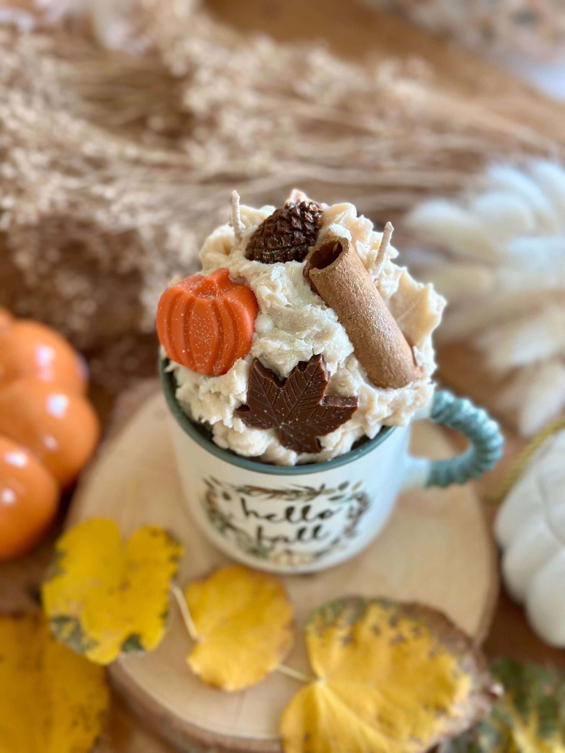 Μια φθινοπωρινή δημιουργία γεμάτη γοητεία! Στολισμένη με κολοκύθα, φύλλα και αρώματα δάσους, αυτή η κούπα ξυπνά τη μαγεία της συγκομιδής. Το άρωμα φουντουκιού και καραμέλας χαρίζει γλυκιά θαλπωρή και αναμνήσεις από πρωινά με ζεστό ρόφημα και φρεσκοψημένα γλυκά. Ιδανική για να στολίσεις το σπίτι σου ή να τη χαρίσεις σε όσους αγαπούν τη γλυκιά, γήινη αίσθηση του φθινοπώρου.
